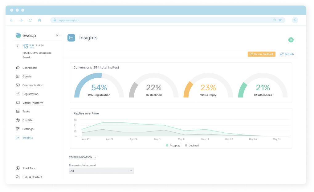 The Insights Panel is fit for in-person, hybrid, or virtual events. The insights it provides are broken down into the categories of Registration, Communication, and Check-in.