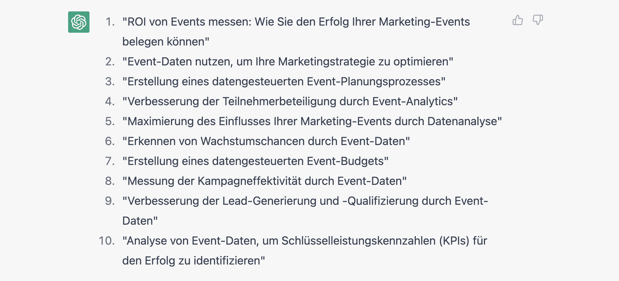 Die Antwort war on-point und wir haben diese 10 Vorschläge vom KI-Tool erhalten: