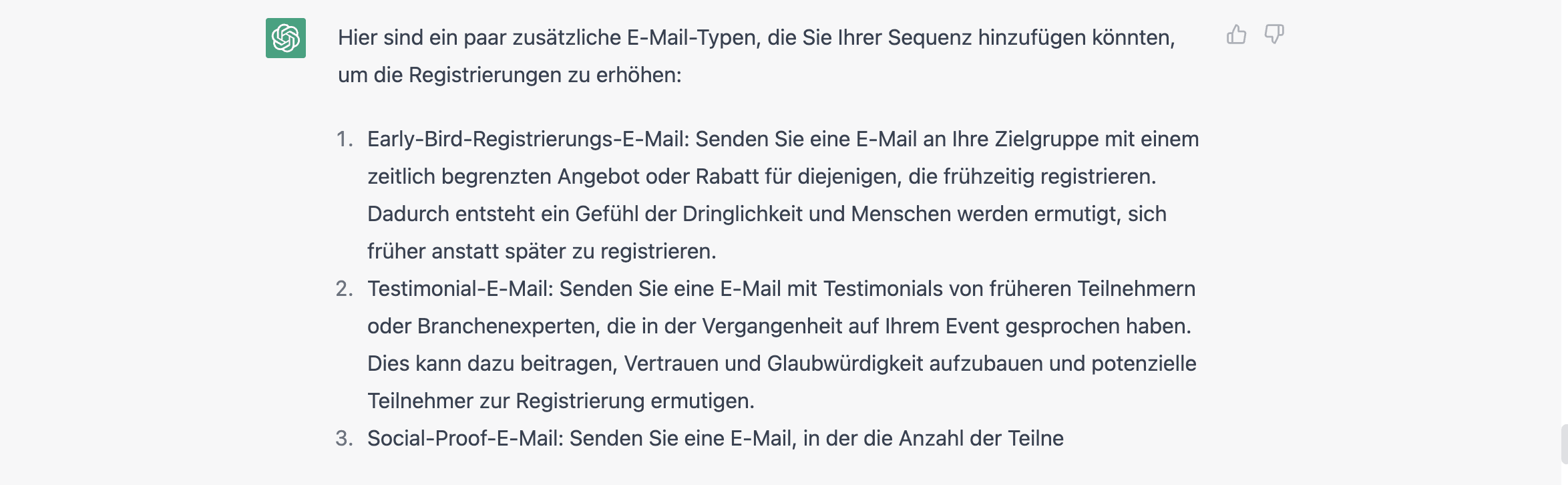 E-Mails sind ein so mächtiges Marketinginstrument - wir konnten es nicht bei den drei vorgeschlagenen Optionen belassen. Deshalb haben wir das Tool gebeten, uns weitere nützliche E-Mail-Typen vorzuschlagen.