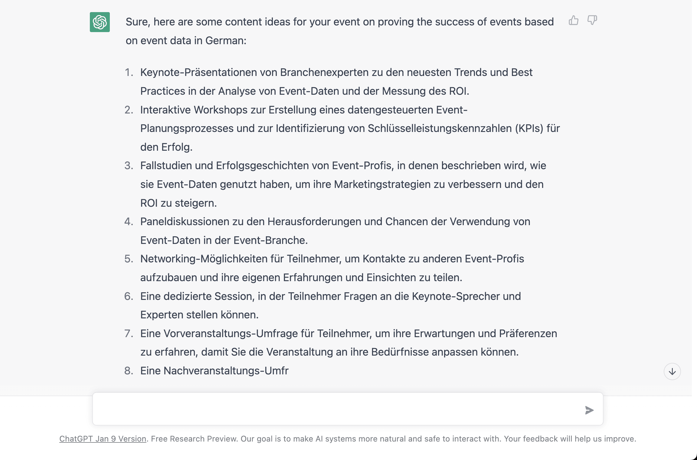 Du musst ChatGPT nur eine entsprechende Frage stellen. Achte darauf, dass du so detailliert wie möglich bist. Gib zum Beispiel die Stadt an, in der du die Veranstaltung durchführen willst, die erwartete Teilnehmer*innenzahl und das Thema der Veranstaltung. Auf diese Weise erhältst du garantiert das richtige Ergebnis.