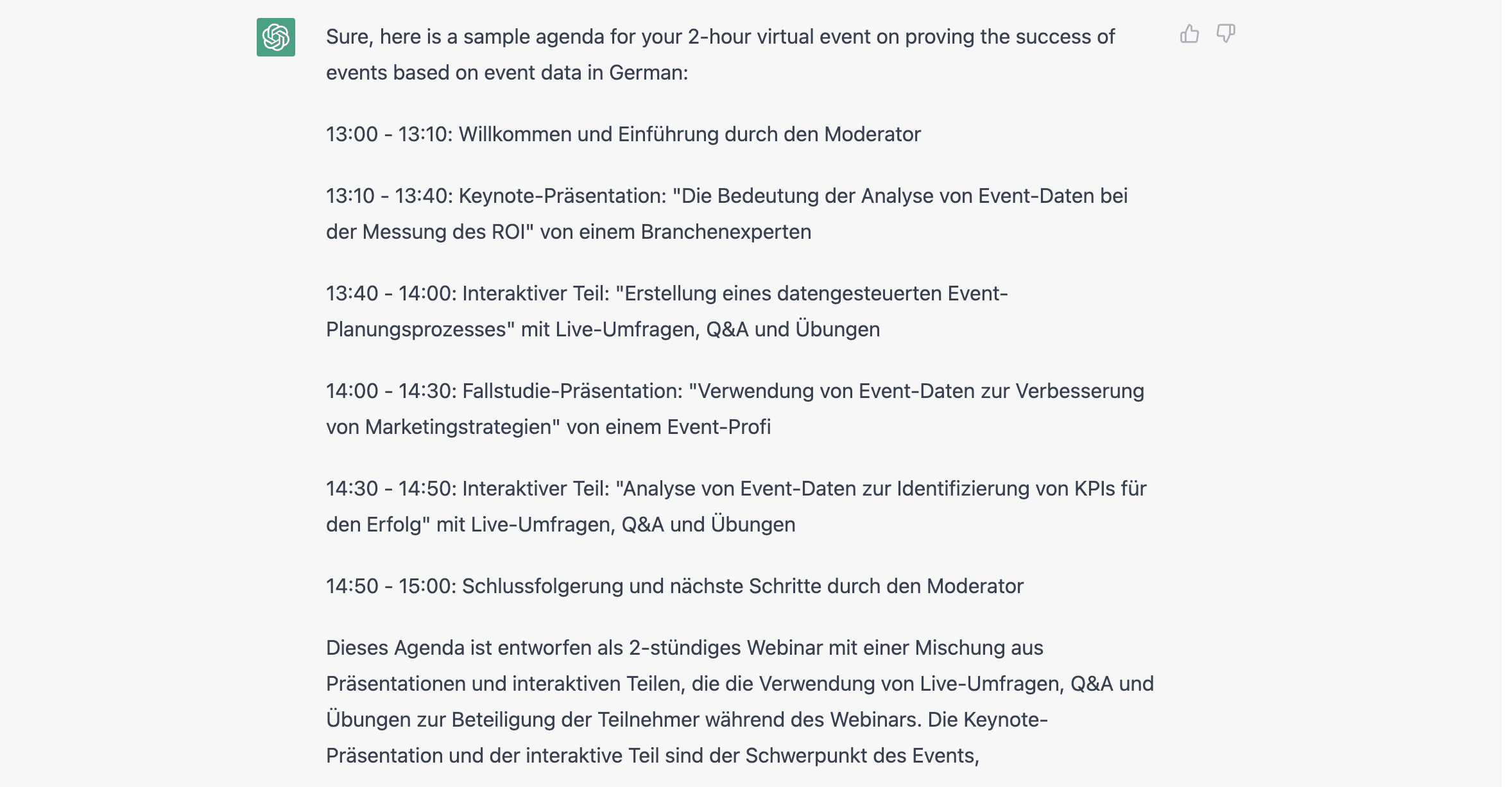 Nachdem wir also alle Materialien für unser Webinar zum Thema Event-ROI und Daten erstellt hatten, wollten wir ChatGPT die Chance geben, sich selbst zu bewerben. Das war unser letzter Wunsch: