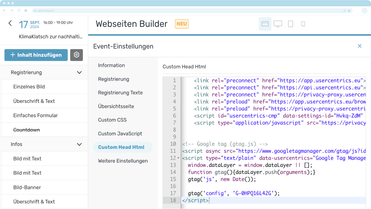 Die Nutzung der richtigen Tools, wie die Event-Management-Software von Sweap, kann diesen Prozess noch reibungsloser gestalten. Sweap bietet integrierte SEO-Funktionen sowie die Möglichkeit, dein Google Analytics-Konto und ein GDPR-freundliches Consent-Banner zu verbinden, um sicherzustellen, dass dein Event aus jeder Perspektive optimiert ist. Agil zu bleiben und durch laufende Analysen informiert zu bleiben, wird dir helfen, dich an Suchtrends anzupassen und dein Event in einem überfüllten digitalen Raum sichtbar zu halten.
