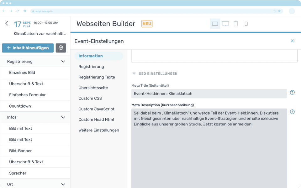 Event-Webseiten in Sweap erlauben das hinzufügen von Meta-Daten