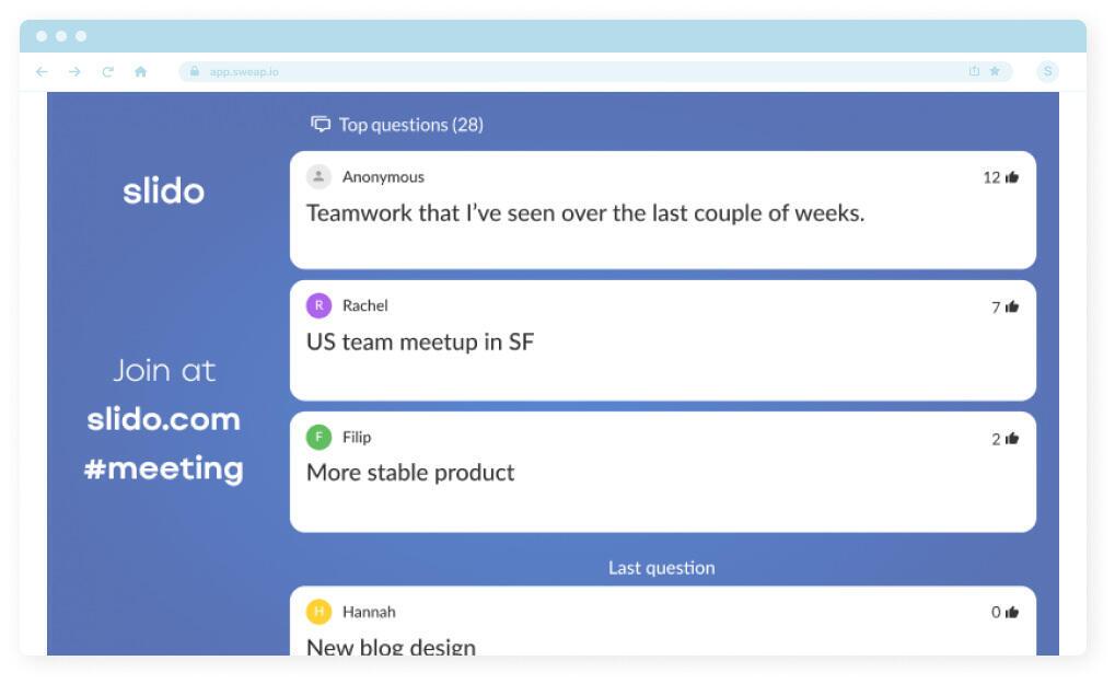 Slido ist nativ in die Virtuelle Event Platform von Sweap integriert.