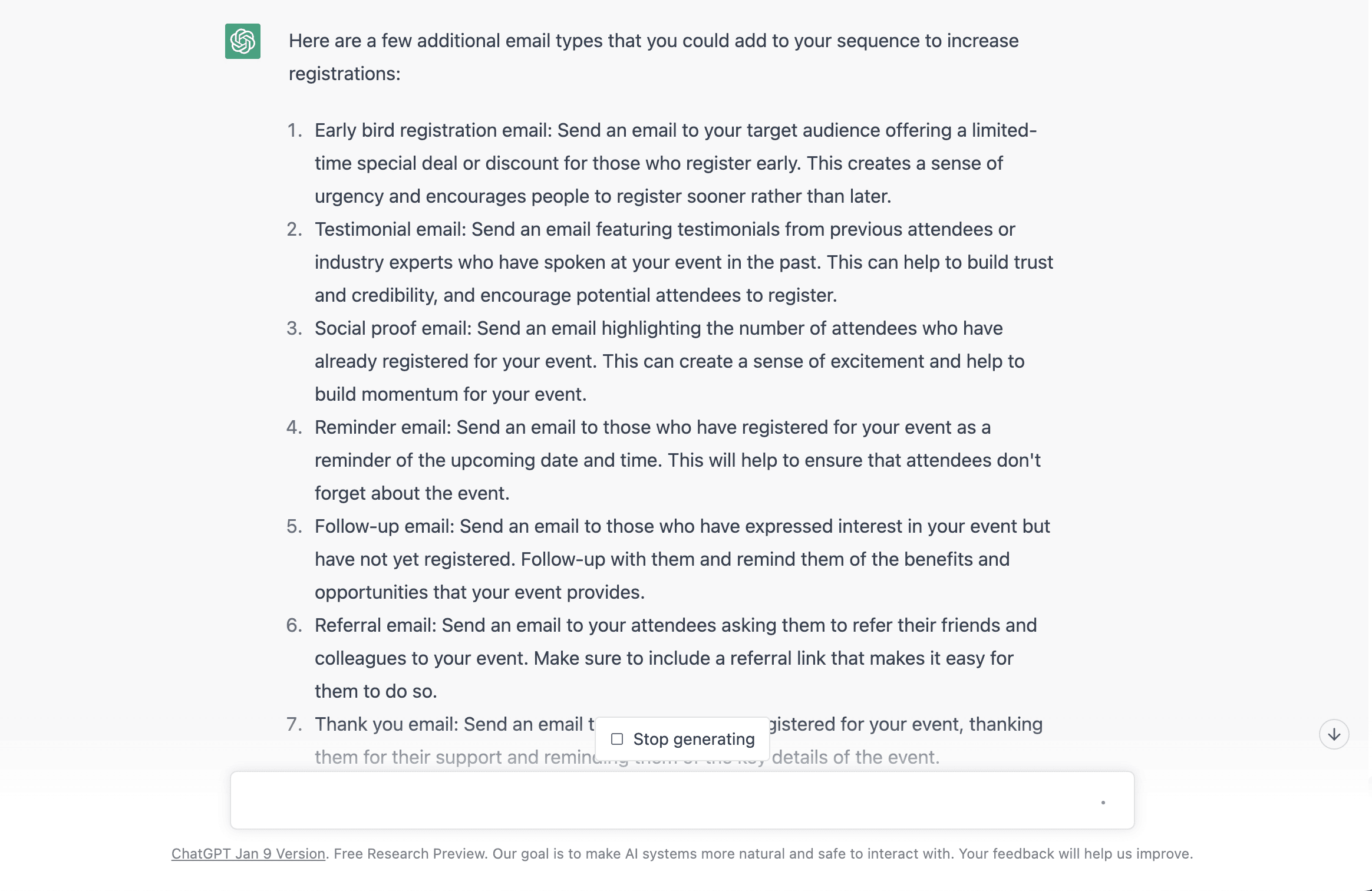 The bot will write an email that you can review and take a few minutes to customize to your liking. Also, you can use ChatGPT for email marketing campaigns such as last-chance to register emails or early-bird pricing emails.