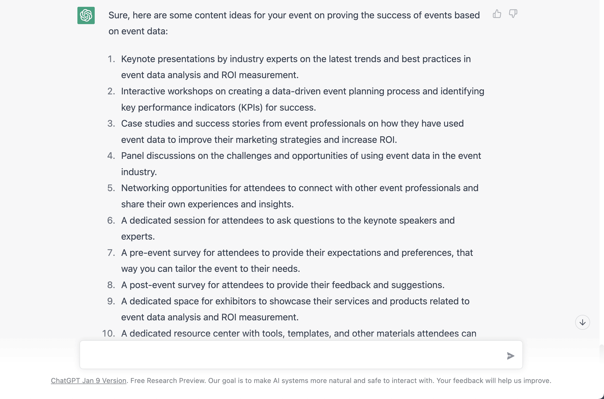 ChatGPT and other AI can help you with content ideas on any topic. If you want to share content on events planning, you could ask the chatbot, "give me ten ideas for articles about event planning."