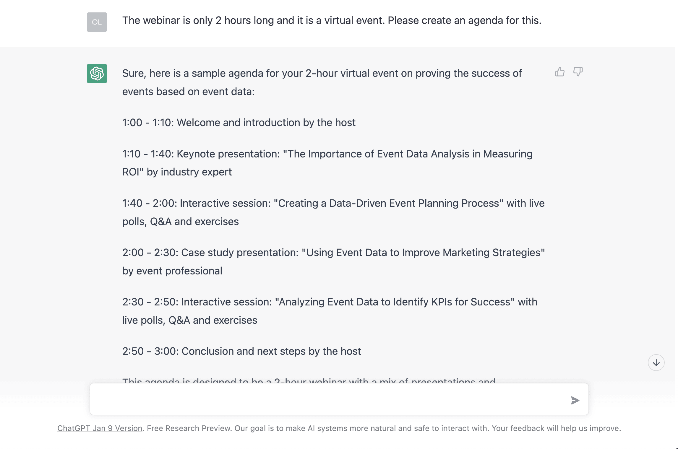 This was the first time ChatGPT was not able to give us a logical answer to our request, as a two-day agenda is not what we were looking for. A webinar is traditionally shorter and more on-point. Therefore we made a more precise request: