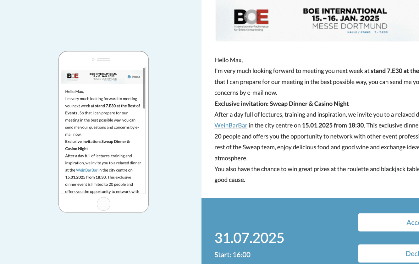Event emails are the key to a successful event. They are the first point of contact between you and your potential participants and have a direct impact on how well your event is perceived. A well-thought-out and appealing email can not only spark curiosity and excitement but also convey the most important information clearly and convincingly, prompting your target audience to sign up and participate.