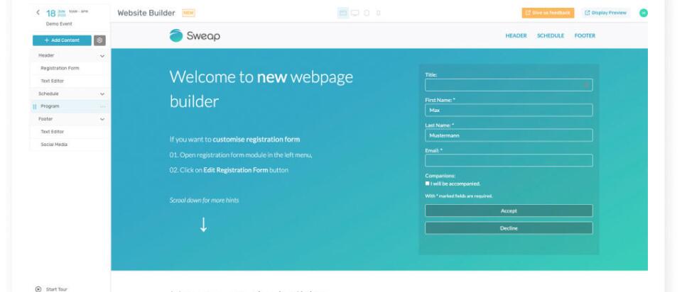 Gone are the days of frustrating static pages with no room for flexibility. Gone equally are the days of ugly unintuitive Web Builders wherein users get lost amid the poorly explained, poorly laid-out options. The Sweap Web Builder is the perfect Goldilocks solution for busy event professionals who take pride in their work.