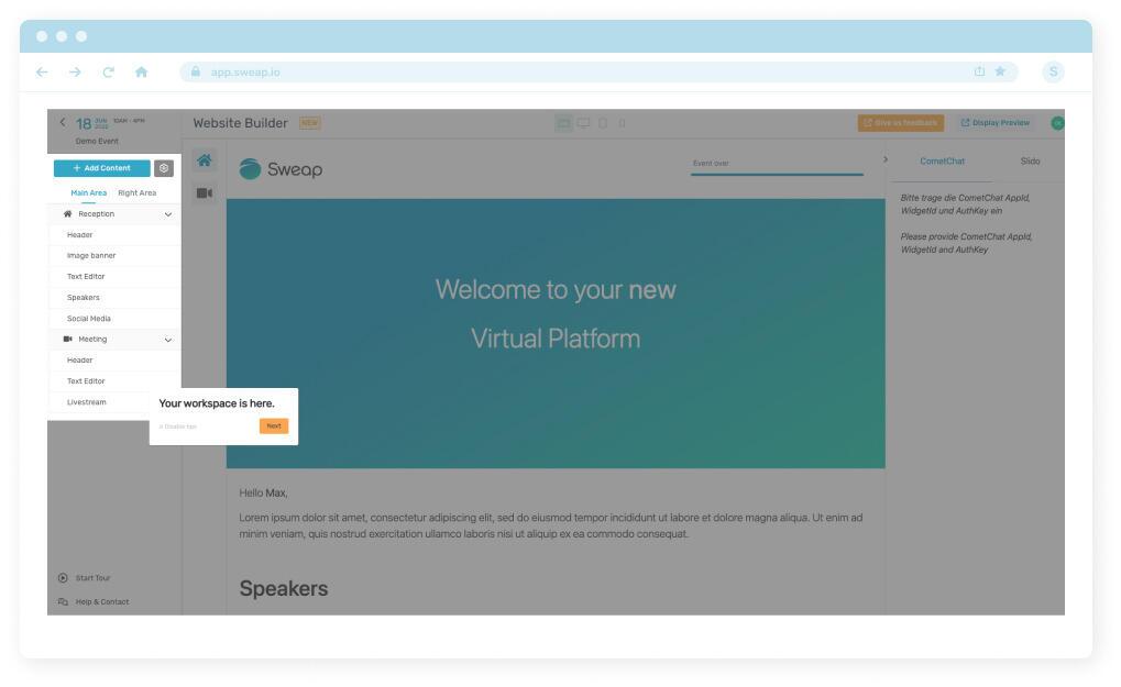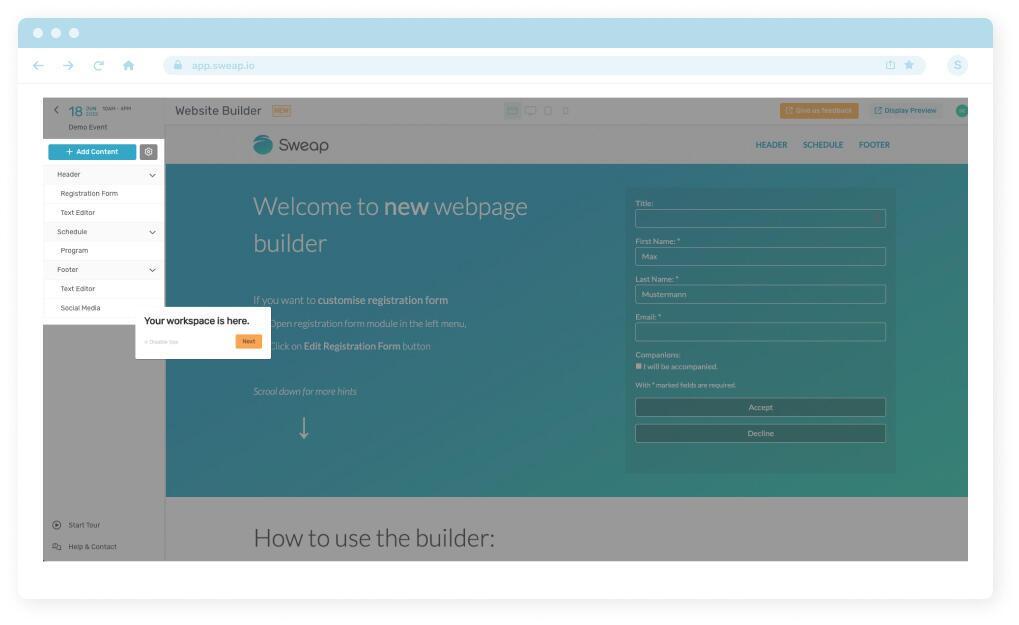 Gone are the days of frustrating static pages with no room for flexibility. Gone equally are the days of ugly unintuitive Web Builders wherein users get lost amid the poorly explained, poorly laid-out options. The Sweap Web Builder is the perfect Goldilocks solution for busy event professionals who take pride in their work.