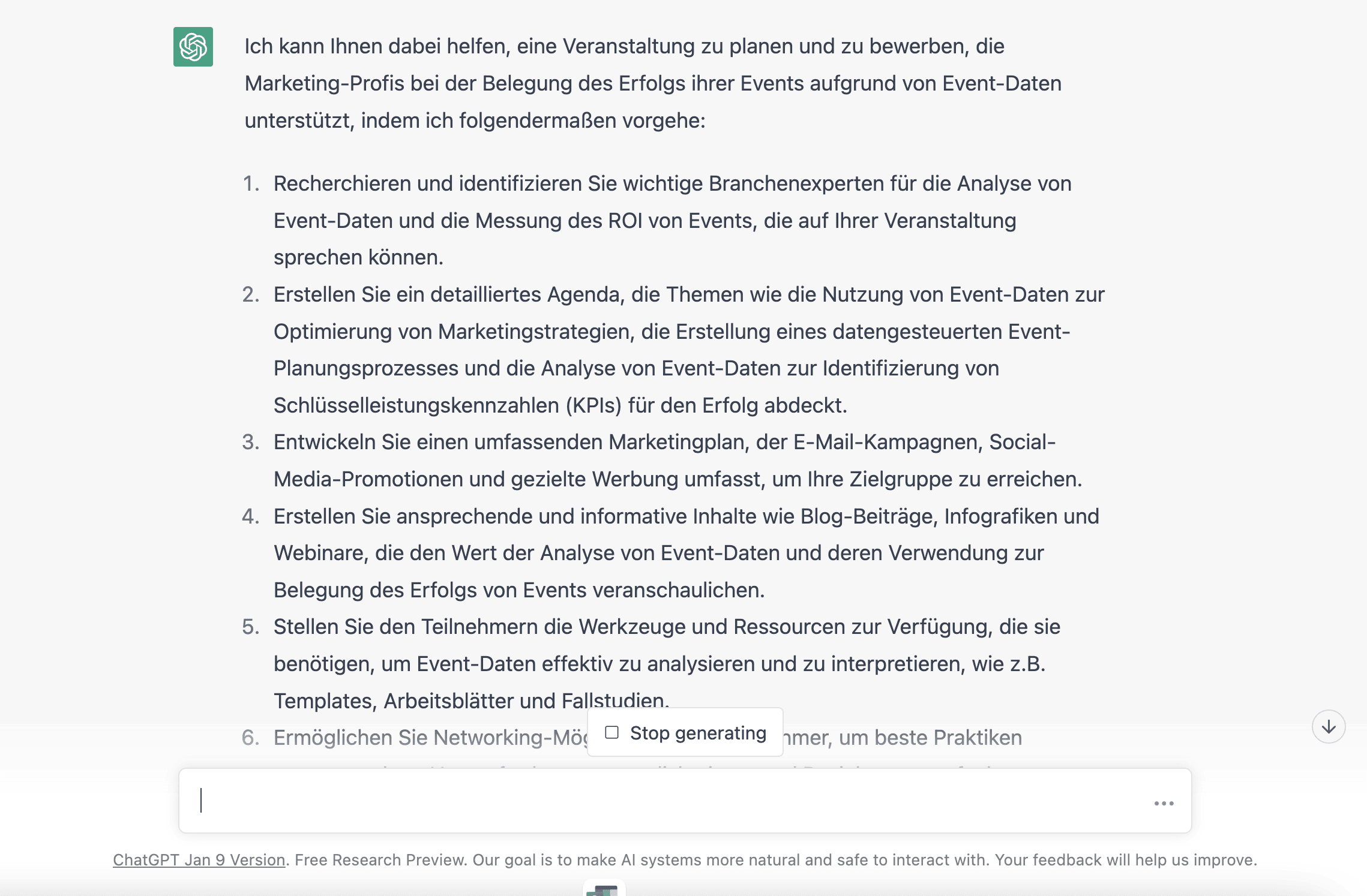 Du musst ChatGPT nur eine entsprechende Frage stellen. Achte darauf, dass du so detailliert wie möglich bist. Gib zum Beispiel die Stadt an, in der du die Veranstaltung durchführen willst, die erwartete Teilnehmer*innenzahl und das Thema der Veranstaltung. Auf diese Weise erhältst du garantiert das richtige Ergebnis.