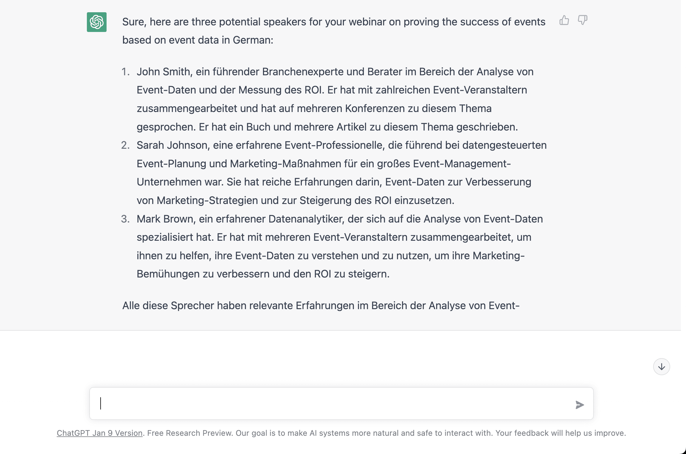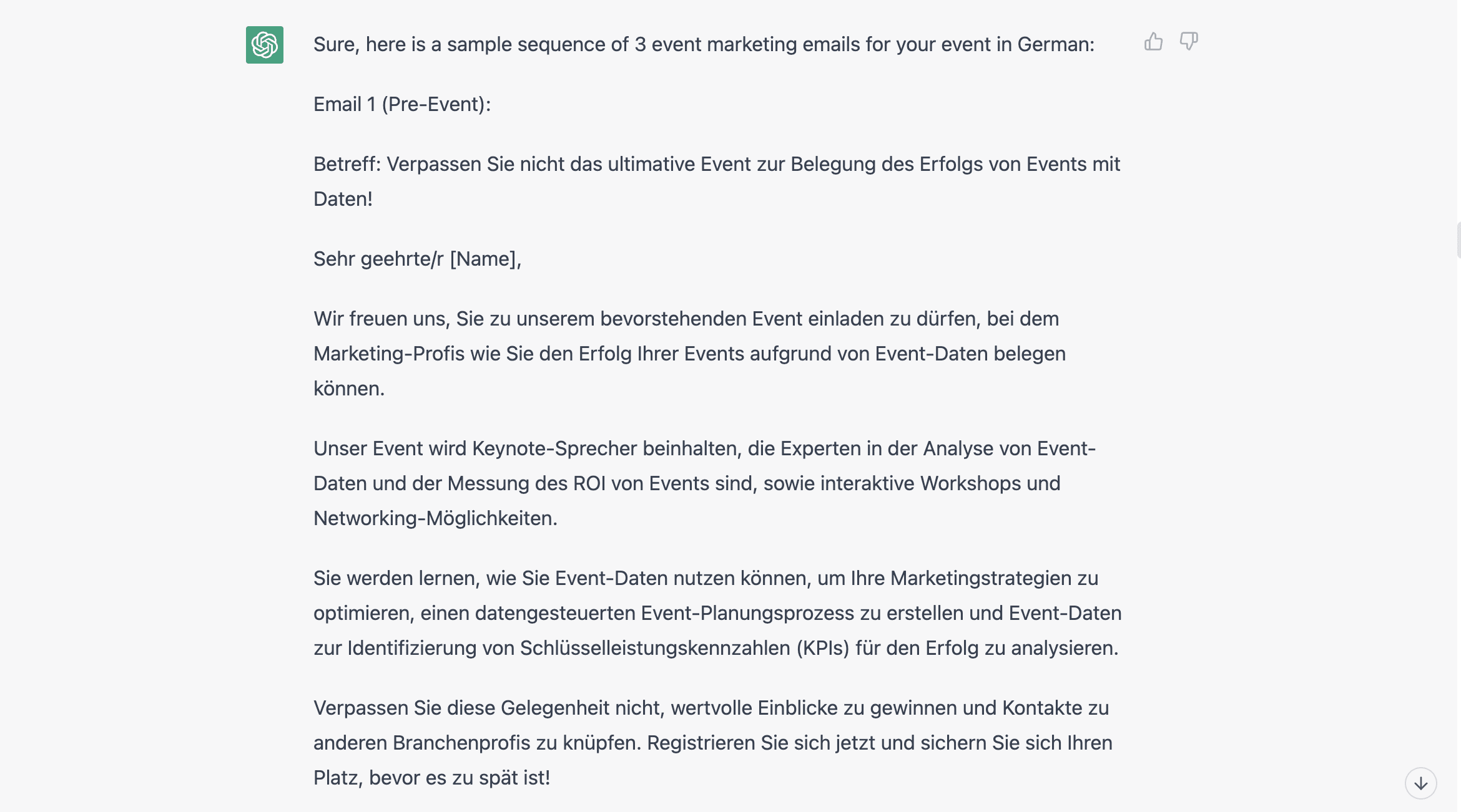 Nachdem wir also alle Materialien für unser Webinar zum Thema Event-ROI und Daten erstellt hatten, wollten wir ChatGPT die Chance geben, sich selbst zu bewerben. Das war unser letzter Wunsch: