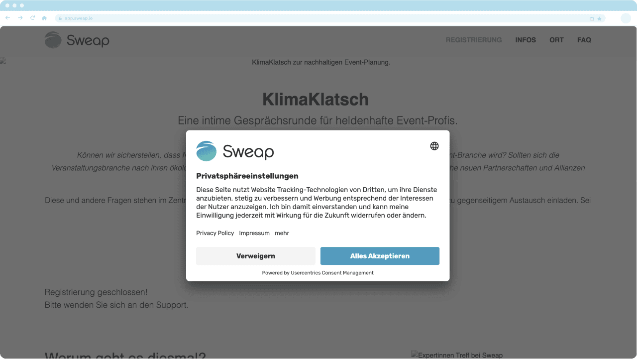 Mit Event-Management-Software wie Sweap kannst du dein Tracking Tool ganz einfach verbinden, um detaillierte Einblicke in den Traffic, die Conversions und das User-Verhalten deiner Event-Website zu erhalten. Zusätzlich ermöglicht dir Sweap, GDPR-konforme Consent-Banner hinzuzufügen, die deine Webseite opt-out-freundlich macht und sicherstellt, dass deine sie auch den Datenschutzrichtlinien entspricht.