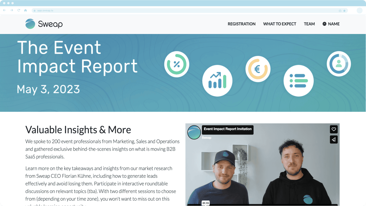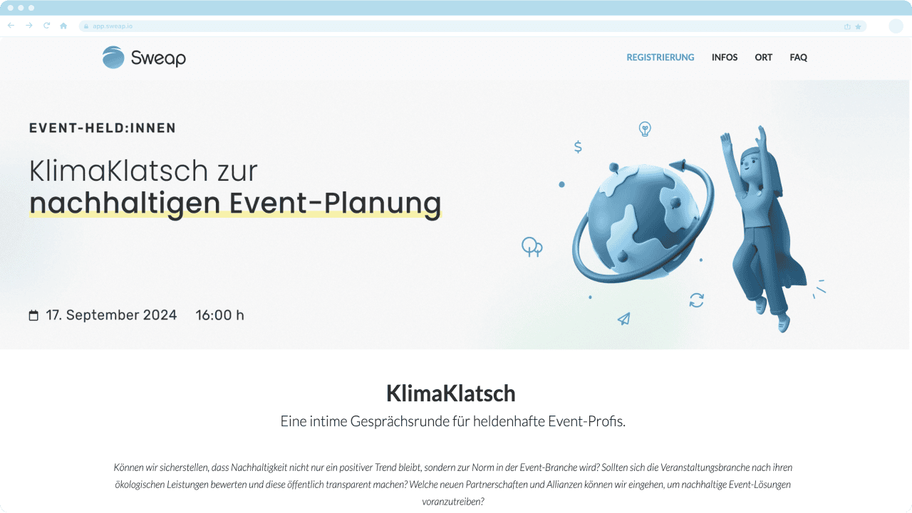 Von der Erstellung SEO-freundlicher Registrierungsseiten bis hin zur Analyse von Leistungsdaten bietet dir Sweap die Werkzeuge, um die digitale Präsenz deines Events effizient zu verwalten. Bereit zu entdecken, wie Sweap dein Event-Marketing einfacher machen kann? Buche eine Demo mit einem unserer Event. Expert*innen und finde heraus, wie wir dir dabei helfen können, dein nächstes Event zu optimieren.