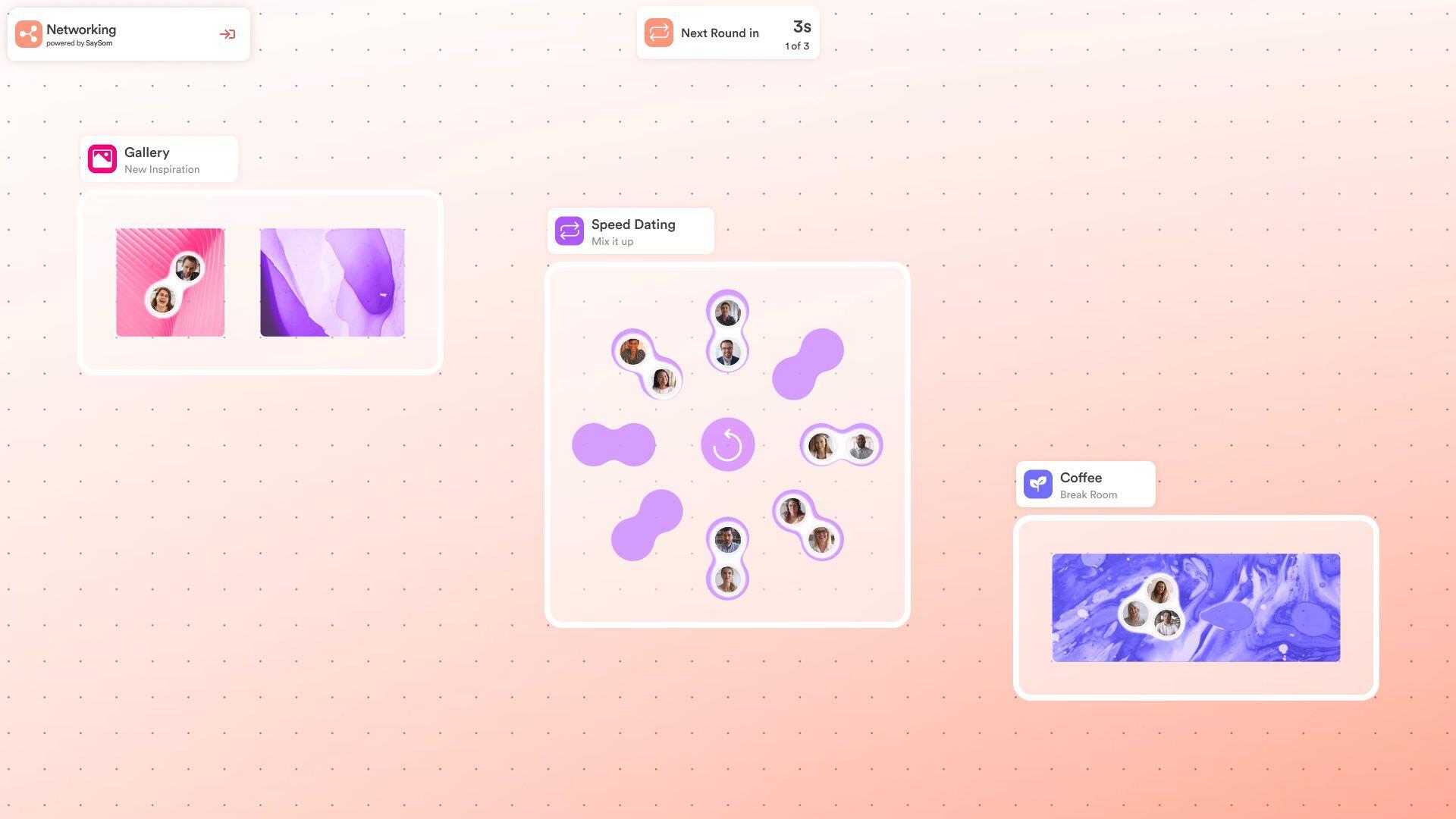 SaySom ist ein Networking-Tool für Online-Events. Mit Sweap kann SaySom ganz einfach in dein virtuelles Event integriert werden. So wird es für die Teilnehmer/innen noch einfacher, sich zu treffen und danach auf deiner Veranstaltungsseite zu bleiben.