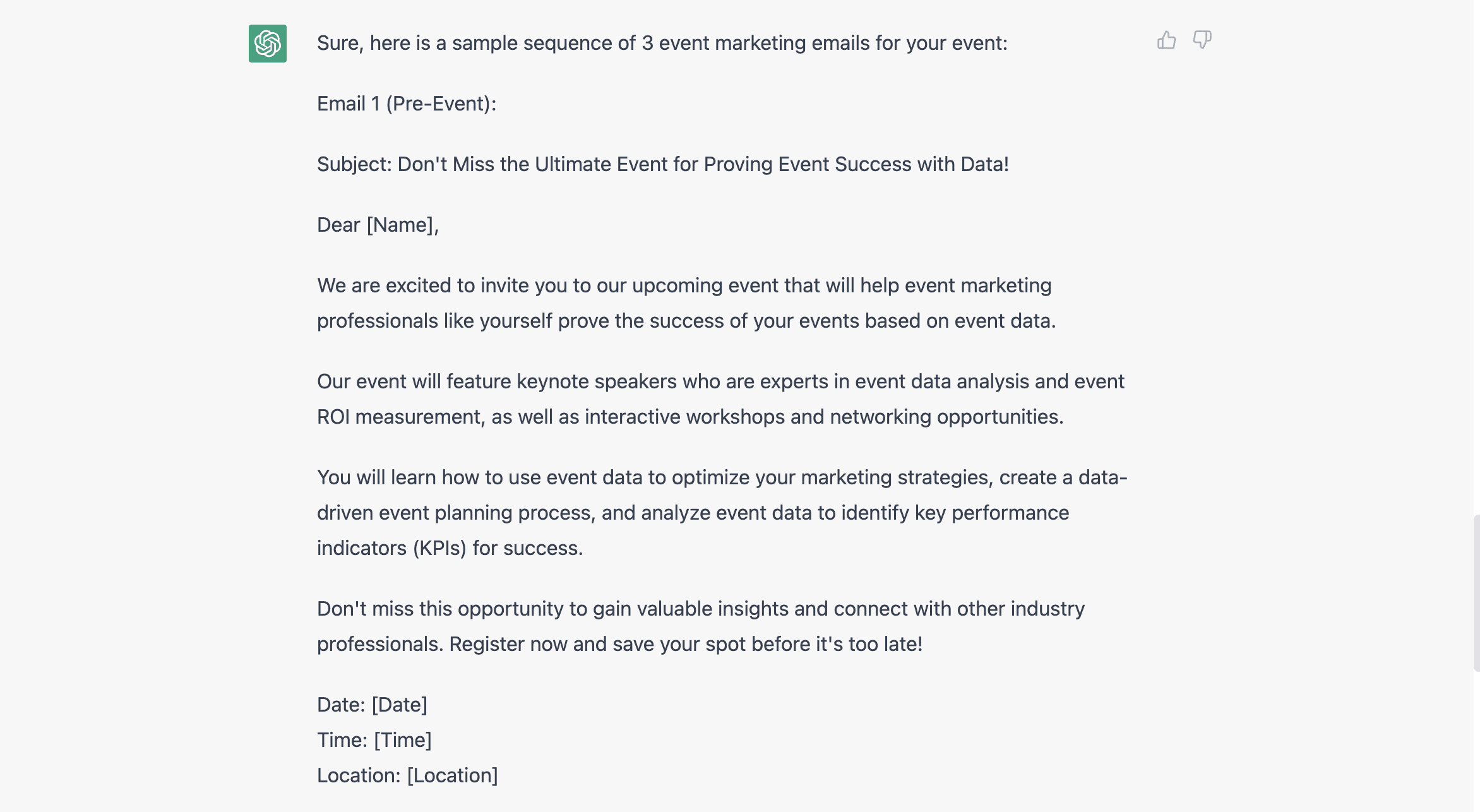 The bot will write an email that you can review and take a few minutes to customize to your liking. Also, you can use ChatGPT for email marketing campaigns such as last-chance to register emails or early-bird pricing emails.