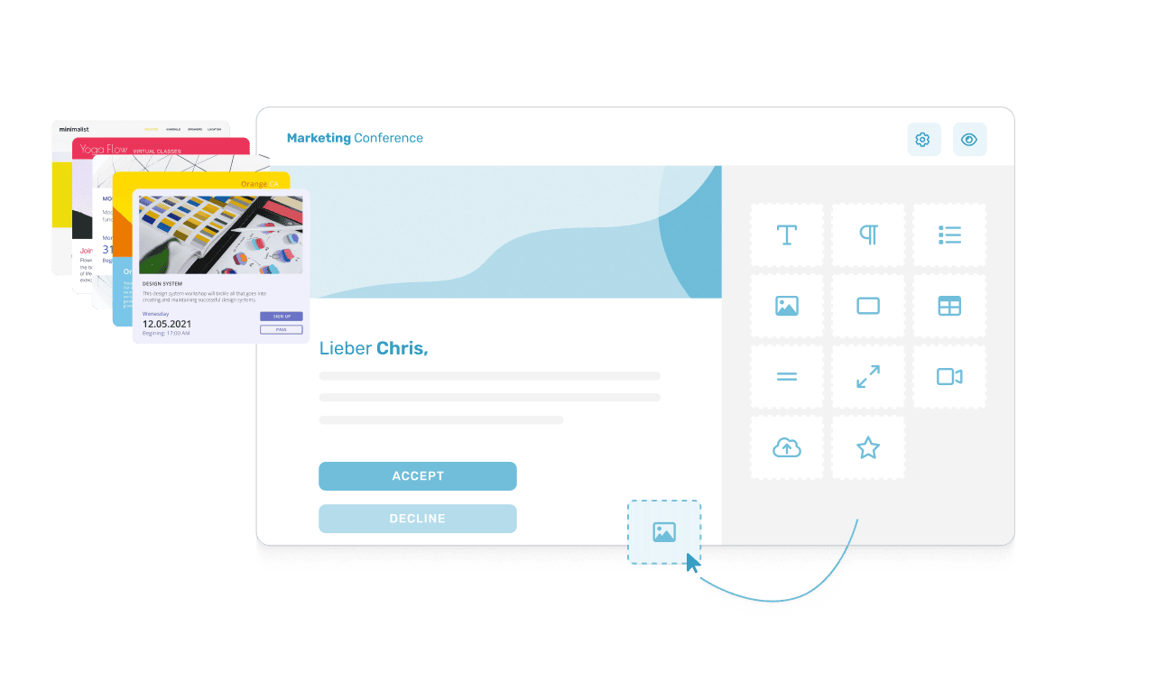 A dynamic email builder allows you to adapt every element of your invitation flexibly, from layout, colors, and fonts to much more.