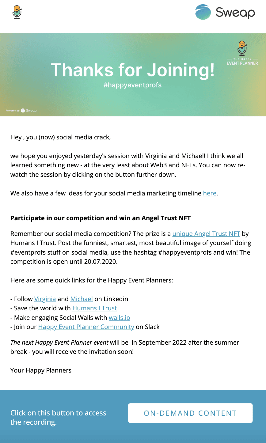 Post-event period is when many people are still feeling inspired, motivated and ready to take action on what they learned at your event. You can use this time to share recordings of your event with those who attended, as well as anyone who couldn't make it.